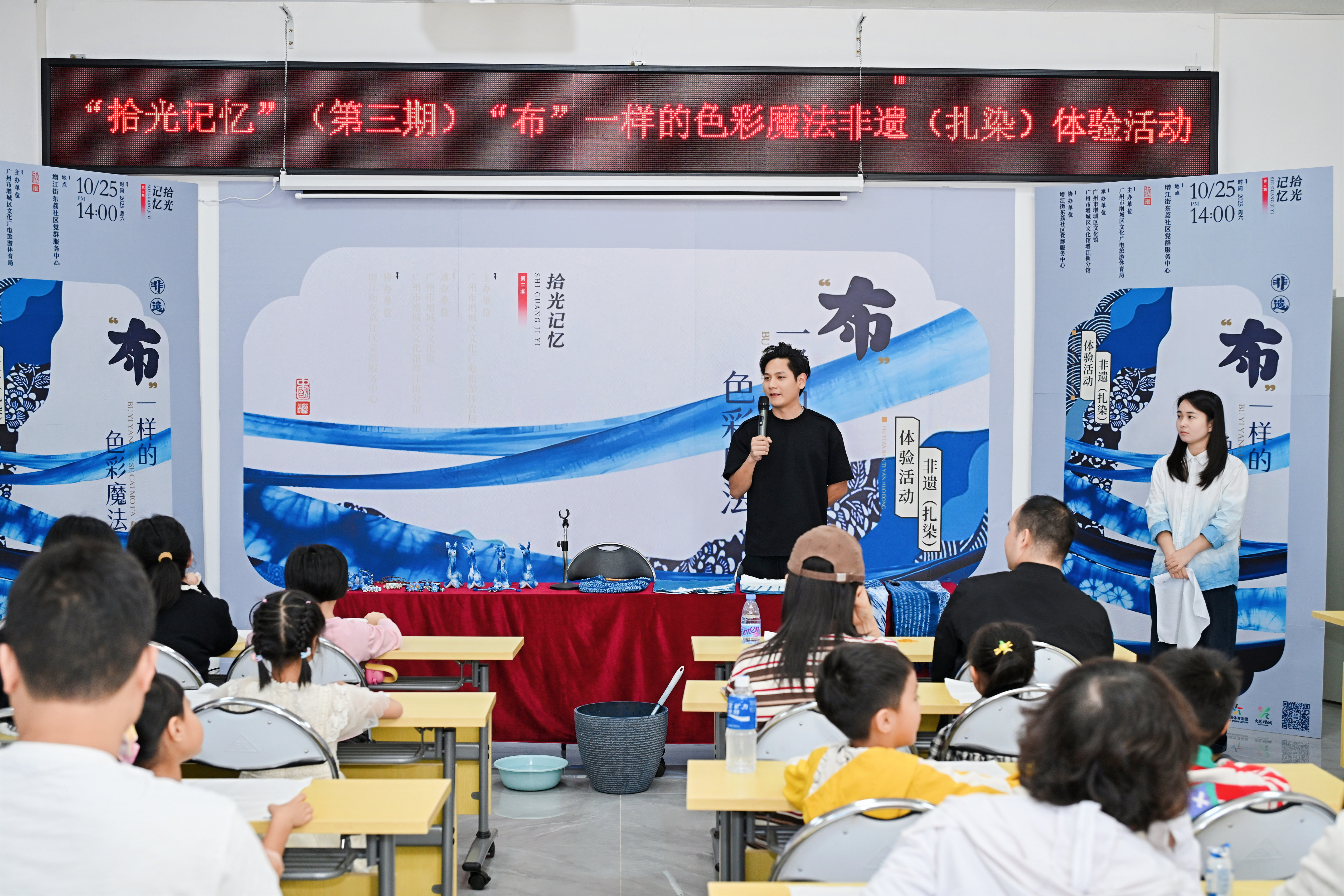 活动现场,增城区扎染非遗传承人叶建基为参与者们讲解了扎染这项古老技艺的历史渊源与文化内涵,并在随后的实践环节示范了捆扎、折叠、夹板等多种扎染技法,并指导大家动手操作。