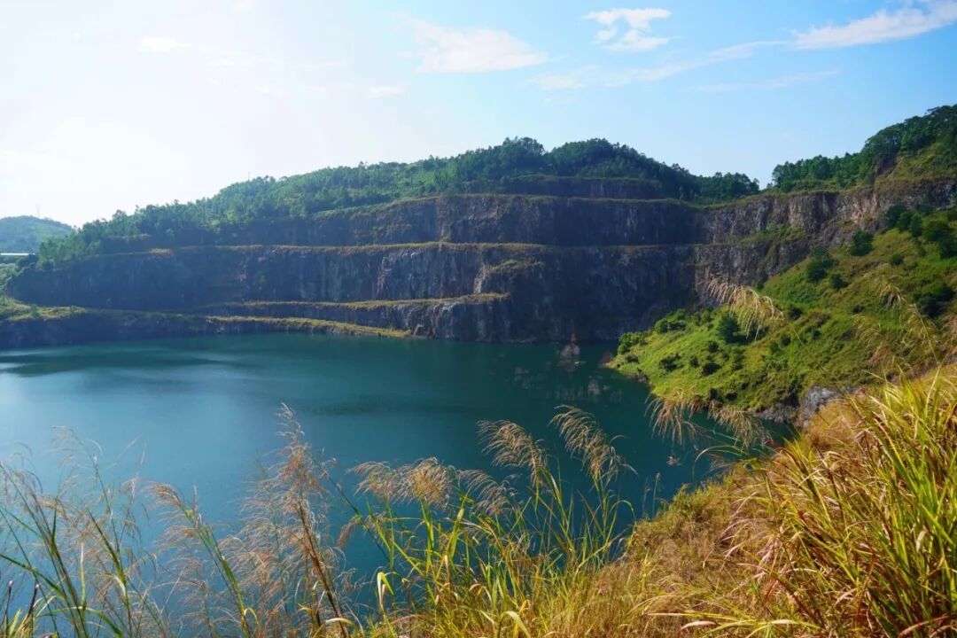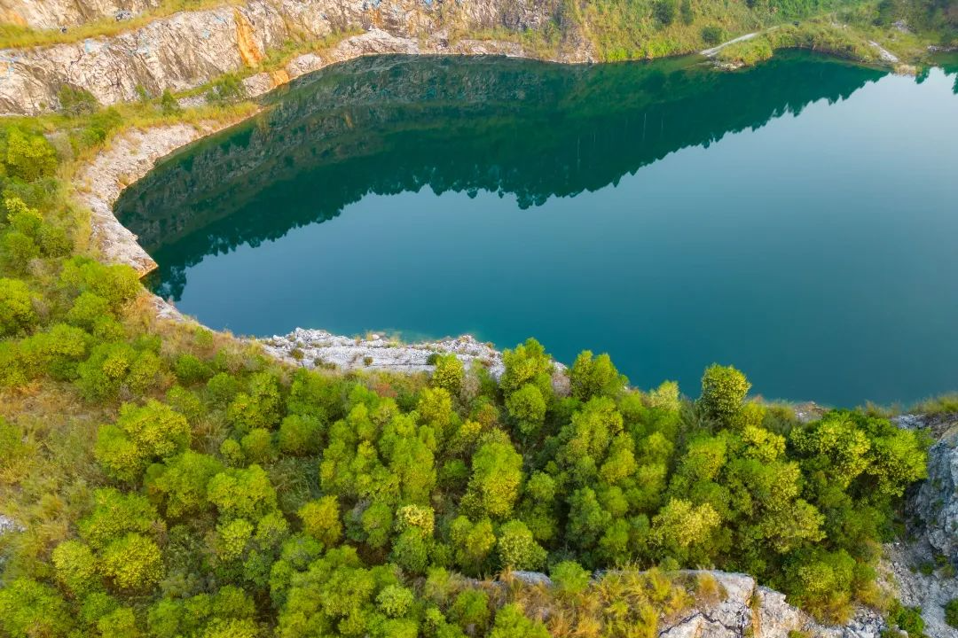 湖水在秋阳下泛着深浅不一的蓝绿色